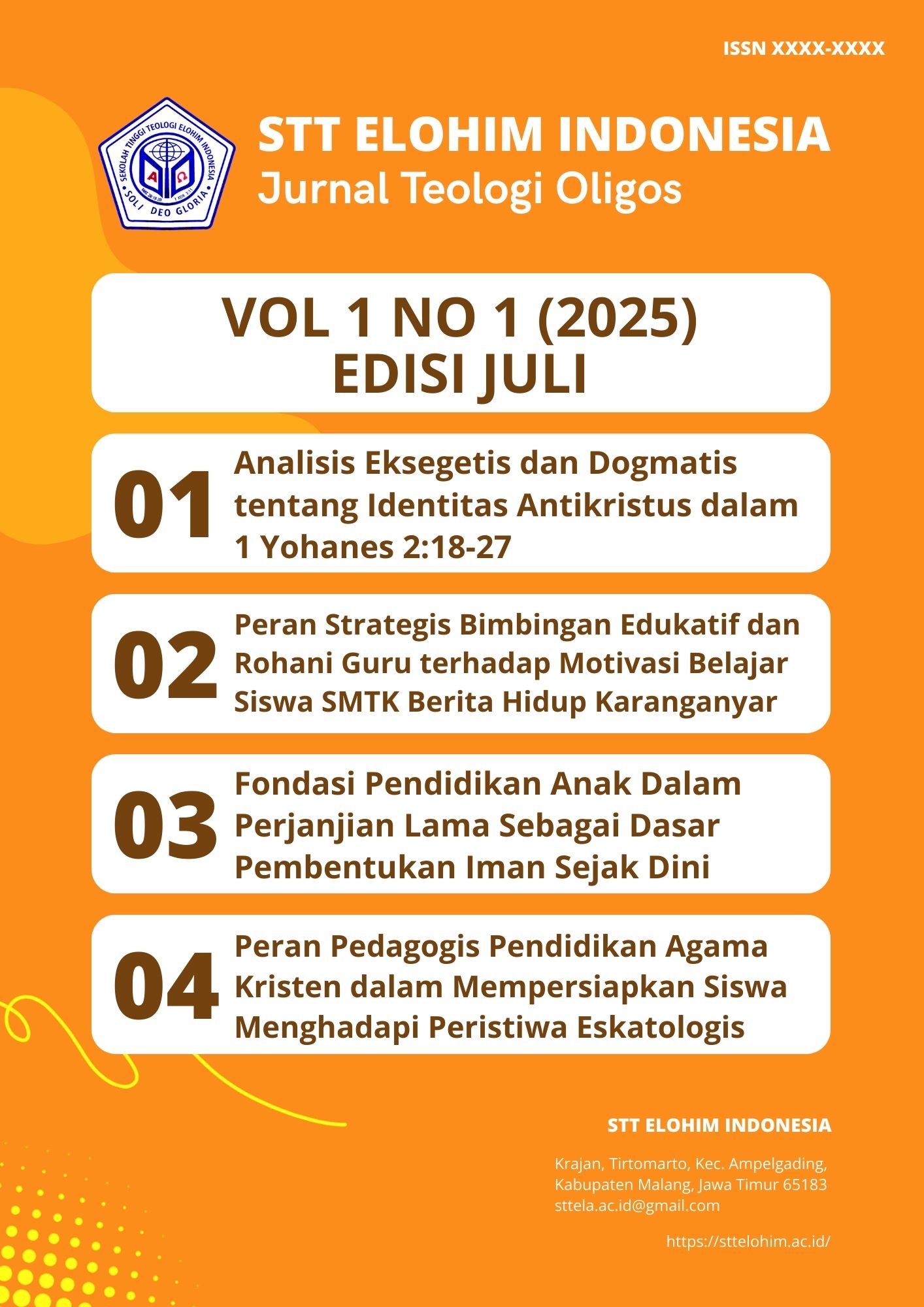 Continuing its commitment to the advancement of theological studies, Jurnal Teologi Oligos (STT Elohim Indonesia) is pleased to release Volume 1 Number 2, December 2025. This issue presents a series of scholarly contributions exploring contemporary issues in Theology, Christian Education, and Missional Strategies. We hope the articles in this edition serve as enriching references for both academic discourse and ecclesiastical practice. We invite researchers to contribute their manuscripts for our upcoming 2026 issues.
